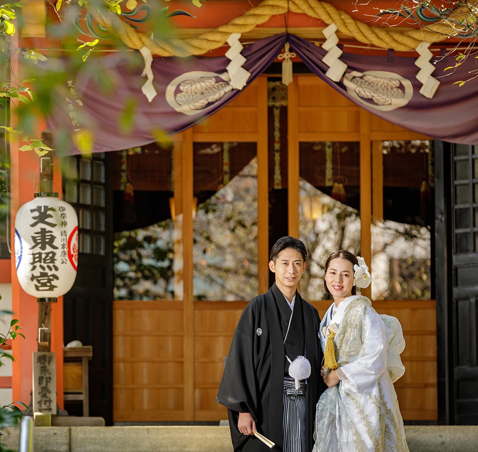 四大東照宮の1つとされる芝東照宮は芝公園の一角にあり緑に囲まれた都会のオアシスとして人気。近くの東京タワーをバックにした撮影も叶います。芝東照宮でのフォトウエディングはクチュールナオコだけの限定プラン。